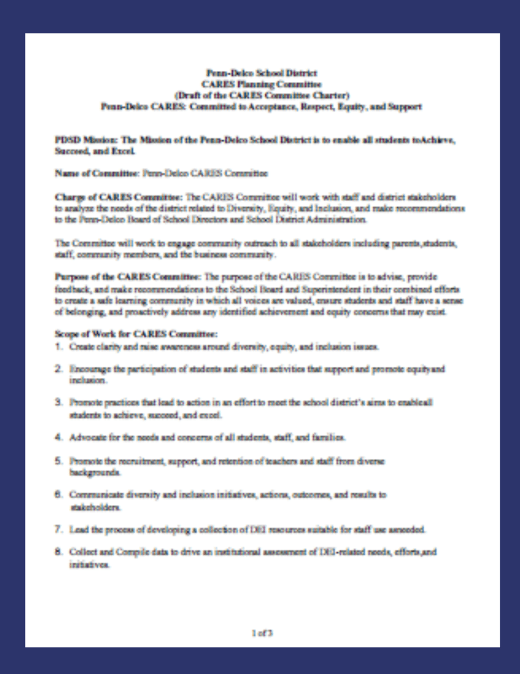 A committee of parents, teachers, students, and school board directors was proposed to advise, provide feedback, and make recommendations to the School Board and Superintendent in their combined efforts to create a safe learning community in which all voices are valued, ensure students and staff have a sense of belonging, and proactively address any identified achievement and equity concerns that may exist.